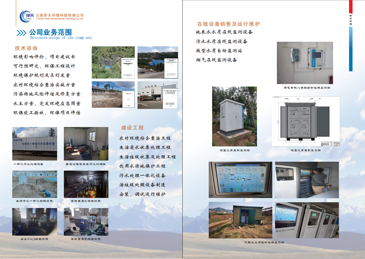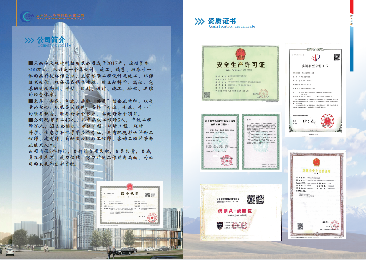 云南澤天環(huán)境科技有限公司成立于2017年,注冊資本500萬元。公司是一個集設(shè)計(jì)、施工、銷售、服務(wù)于一體的高科技環(huán)保企業(yè),主營環(huán)保工程設(shè)計(jì)及施工、環(huán)保技術(shù)咨詢、環(huán)保設(shè)備銷售運(yùn)維,建立起科學(xué)、高效、完善的現(xiàn)場勘測、評估、規(guī)劃、設(shè)計(jì)、施工、驗(yàn)收、運(yùn)維的經(jīng)營體系。