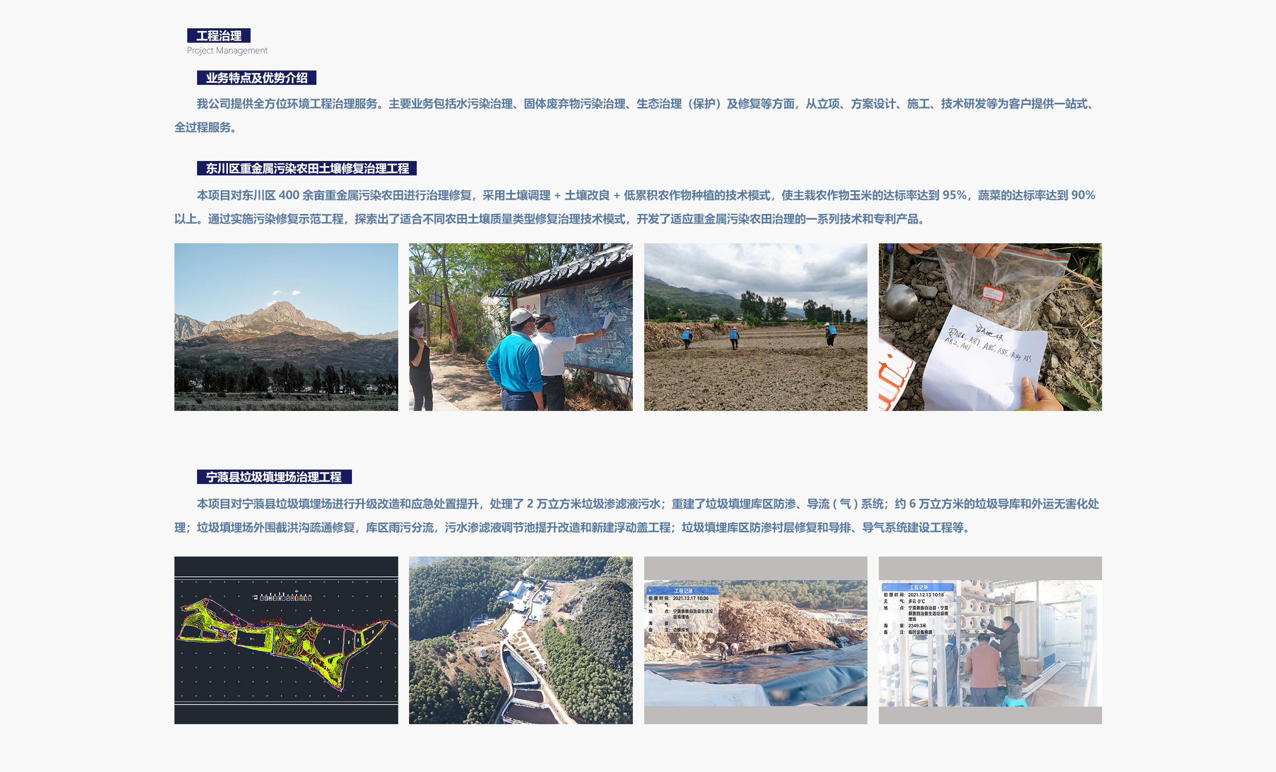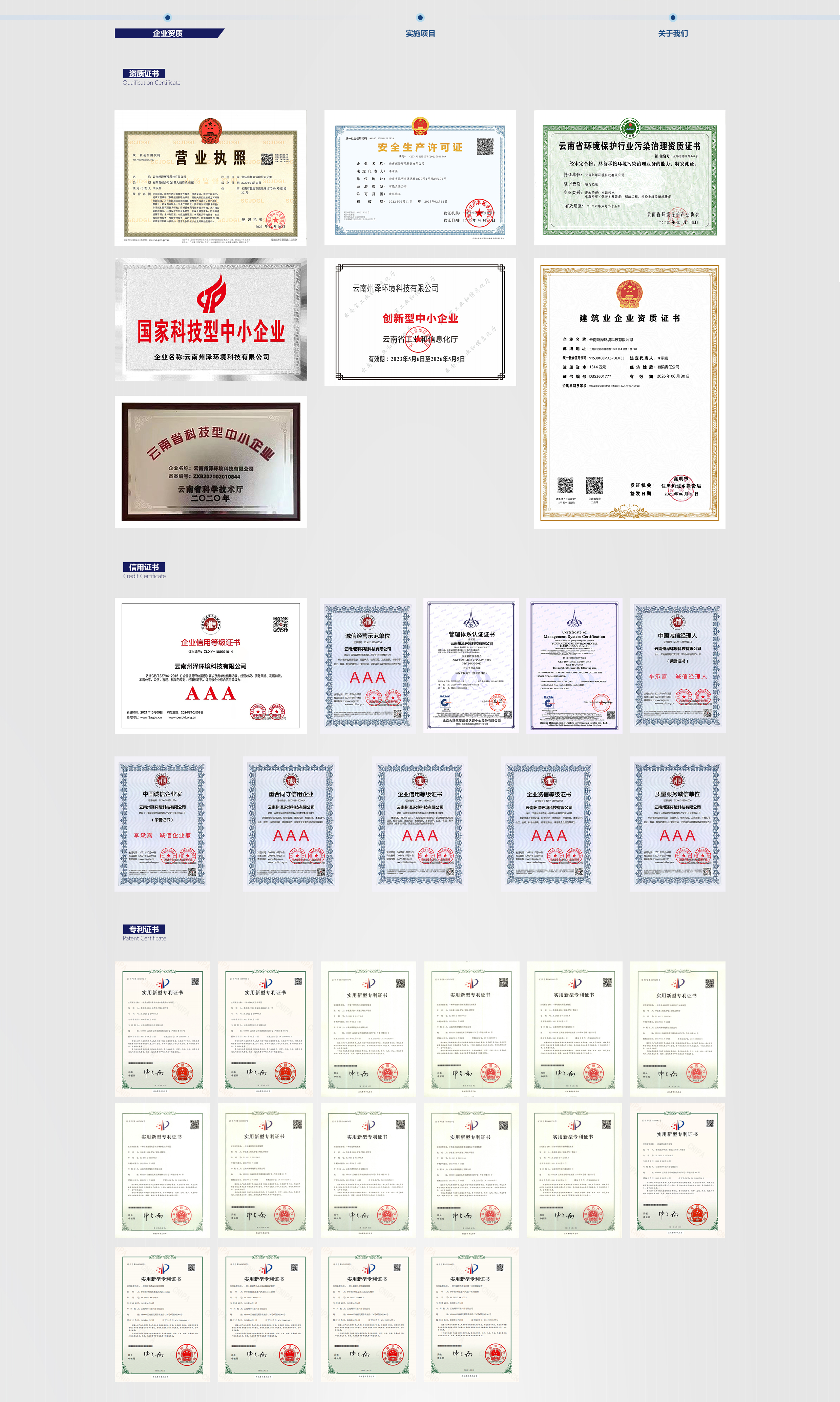 綜合服務(wù)項(xiàng)目業(yè)績(jī)覆蓋生活垃圾及固廢處理處置、流域水環(huán)境綜合治理、農(nóng)村環(huán)境綜合治理、工業(yè)污染場(chǎng)地、農(nóng)用耕地土壤修復(fù)和礦山生態(tài)修復(fù)等領(lǐng)域。具有“環(huán)保工程專業(yè)承包三級(jí)”資質(zhì),獲得質(zhì)量管理體系、AAA企業(yè)信用等級(jí)、國(guó)家及云南省科技型中小企業(yè)等證書,并取得16項(xiàng)專利。