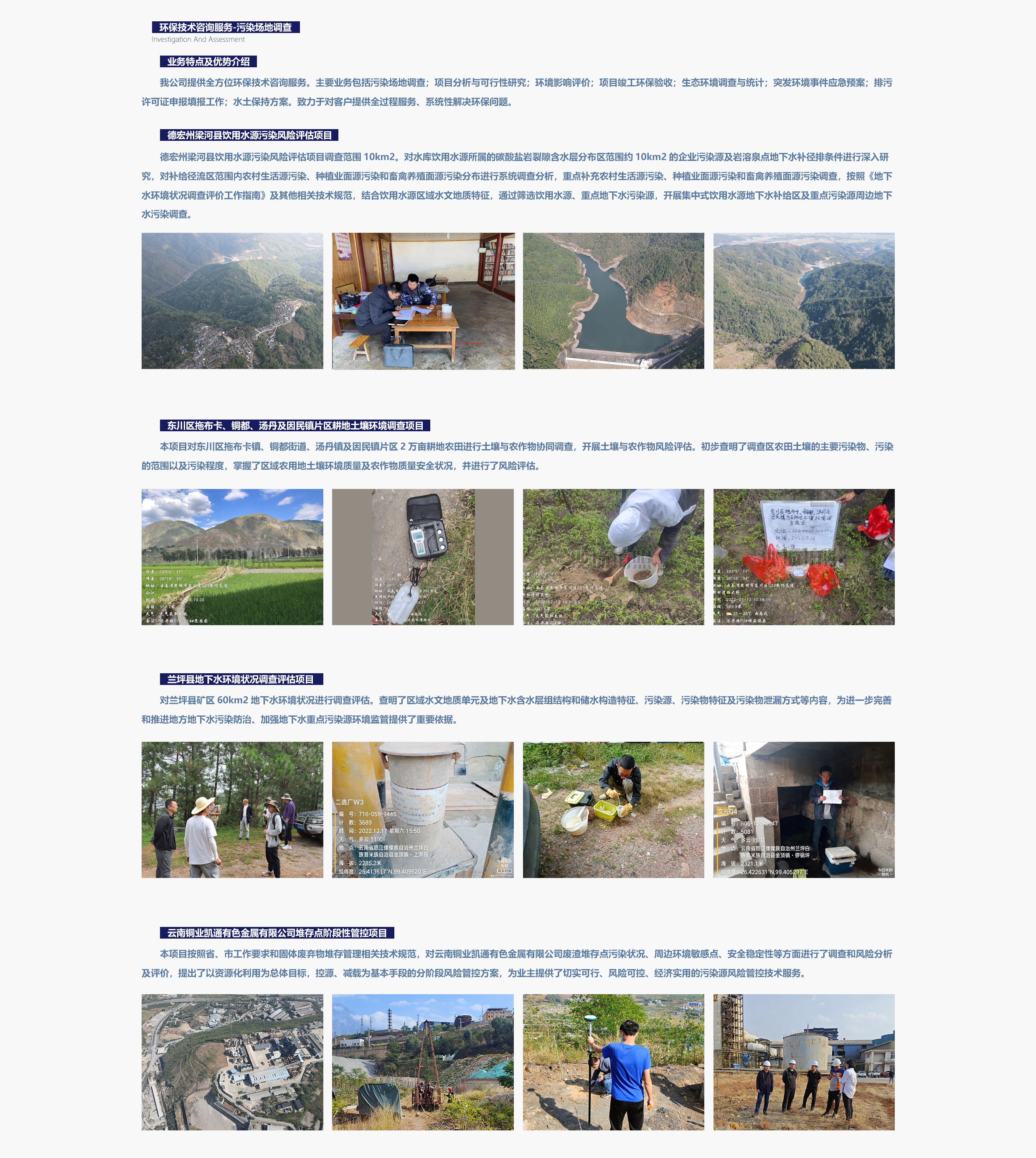 綜合服務(wù)項(xiàng)目業(yè)績(jī)覆蓋生活垃圾及固廢處理處置、流域水環(huán)境綜合治理、農(nóng)村環(huán)境綜合治理、工業(yè)污染場(chǎng)地、農(nóng)用耕地土壤修復(fù)和礦山生態(tài)修復(fù)等領(lǐng)域。具有“環(huán)保工程專(zhuān)業(yè)承包三級(jí)”資質(zhì),獲得質(zhì)量管理體系、AAA企業(yè)信用等級(jí)、國(guó)家及云南省科技型中小企業(yè)等證書(shū),并取得16項(xiàng)專(zhuān)利。