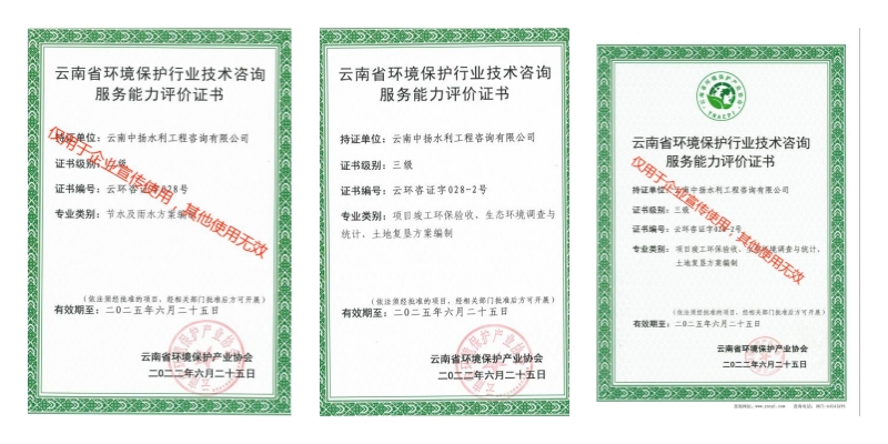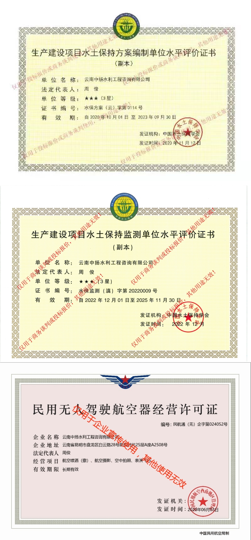 云南中揚(yáng)水利工程咨詢有限公司成立于2011年,注冊資金100萬元整。公司從事的主要業(yè)務(wù)為生產(chǎn)建設(shè)項(xiàng)目水土保持咨詢設(shè)計(水保方案編制、水保監(jiān)測、技術(shù)評估及咨詢)、水土保持規(guī)劃、水利工程設(shè)計(農(nóng)田水利、河道)、可行性研究報告編制、土地復(fù)墾等。公司已取得水土保持方案編制、水土保持監(jiān)測、工程咨詢備案、環(huán)境污染治理、環(huán)境保護(hù)行業(yè)技術(shù)咨詢服務(wù)能力評價證書、民用無人駕駛航空器經(jīng)營許可證等資格證書,是云南省水土保持學(xué)會和云南省環(huán)境保護(hù)協(xié)會會員。